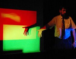 Additive mixing combines two or more colors into a mixture with brightness equal to the sum of the components' brightnesses.[1]:4.4 An ideal physical model to demonstrate the additive model comprises two superimposed colored lights aimed at the observer. The additive model is usually demonstrated by reflecting two beams of colored light off a white, matte surface (e.g. projectors) or by analyzing the sub-pixels of a color display, both of which follow the additive model closely.