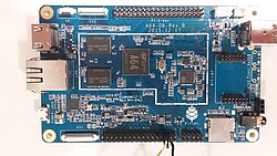 The original Pine A64 boards released in 2016 are powered by the Allwinner A64 system-on-chip. It features a 1.2 GHz Quad-Core ARM Cortex-A53 64-Bit Processor, an ARM Mali 400 MP2 graphics processor unit, one HDMI 1.4a port, one MicroSD slot, two USB 2.0 ports and a 100 Megabit Ethernet port. The A64 board has only 512 megabytes of RAM, the 1 GB and 2 GB versions are labeled "Pine A64+".[10] While the 512 MB model only works with Arch Linux and Debian GNU/Linux distributions, such as Armbian or DietPi,[11] the A64+ with more memory can also run other operating systems including Android, Remix OS, Windows 10,[12] FreeBSD,[13] and Ubuntu.[14] Optional eMMC storage modules can be plugged into special headers on the board.