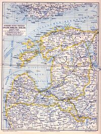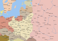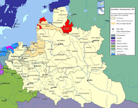 In 1561, during the Livonian War, Livonia fell to the Grand Duchy of Lithuania[6][7][8] and became a dependent vassal of Lithuania.[8] Eight years later, in 1569, when the Grand Duchy of Lithuania and the Kingdom of Poland formed the Polish–Lithuanian Commonwealth, Livonia became a joint domain administered directly by the king and grand duke.[6][8][9][10][11][12] Having rejected peace proposals from its enemies, Ivan the Terrible found himself in a difficult position by 1579, when Crimean Khanate devastated Muscovian territories and burnt down Moscow (see Russo-Crimean Wars), the drought and epidemics have fatally affected the economy, Oprichnina had thoroughly disrupted the government, while The Grand Principality of Lithuania had united with The Kingdom of Poland (1385–1569) and acquired an energetic leader, Stefan Batory, supported by Ottoman Empire (1576). Stefan Batory replied with a series of three offensives against Muscovy, trying to cut The Kingdom of Livonia from Muscovian territories. During his first offensive in 1579, with 22,000 men, he retook Polotsk; during the second, in 1580, with 29,000-strong army, he took Velikie Luki, and in 1581 with a 100,000-strong army he started the Siege of Pskov. Frederick II of Denmark and Norway had trouble continuing the fight against Muscovy unlike Sweden and Poland. He came to an agreement with John III in 1580, giving him the titles in Livonia. That war would last from 1577 to 1582. Muscovy recognized Polish–Lithuanian control of Ducatus Ultradunensis only in 1582. After Magnus von Lyffland died in 1583, Poland invaded his territories in The Duchy of Courland, and Frederick II decided to sell his rights of inheritance. Except for the island of Œsel, Denmark was out of the Baltic by 1585. As of 1598 Inflanty Voivodeship was divided onto: