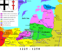Pope Gregory IX asked the Brothers to defend Finland from Novgorodian attacks in his letter of 24 November 1232;[2] however, no known information regarding the knights' possible activities in Finland has survived. (Sweden eventually took over Finland after the Second Swedish Crusade in 1249.) In the Battle of Saule in 1236 the Lithuanians and Semigallians decimated the Order. This disaster led the surviving Brothers to become incorporated into the Order of Teutonic Knights in the following year, and from that point on they became known as the Livonian Order. They continued, however, to function in all respects (rule, clothing and policy) as an autonomous branch of the Teutonic Order, headed by their own Master (himself de jure subject to the Teutonic Order's Grand Master).