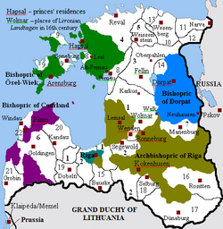 In 1418, the Archbishop of Riga, Johannes Ambundii, organised the five ecclesiastical states of the Holy Roman Empire in Medieval Livonia (Livonian Order, Courland, Ösel–Wiek, Dorpat and Riga) into the Livonian Confederation.[4][5] A diet or Landtag was formed in 1419. The city of Walk was chosen as the site of the diet.