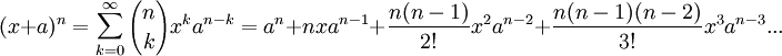 for k>0 and 1 for k=0. As this series contains an infinite number of terms, one must worry whether it converges or not. In the case of the binomial expansion, it always converges if |x/a|<1 or if n a natural number.[1]