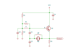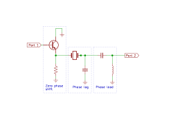 The more common modern form of the circuit uses just the emitter follower stage.[1][6] The circuit may be analysed by considering it as a equivalent AC circuit with three parts. The emitter follower forms an amplifier with no phase shift. The crystal and its loading capacitor then produce a phase lag network, followed by the LC network of the resonant tank circuit. This then produces a phase lead, which overall meets the Barkhausen criteria for self-oscillation.[1]
