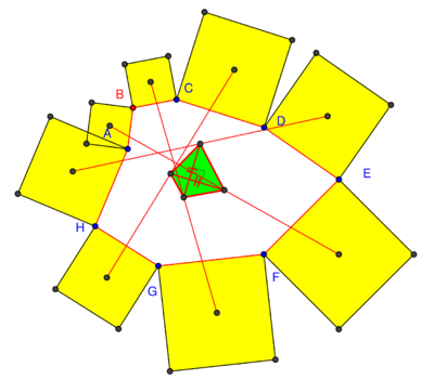 The midpoint octagon of a reference octagon has its eight vertices at the midpoints of the sides of the reference octagon. If squares are constructed all internally or all externally on the sides of the midpoint octagon, then the midpoints of the segments connecting the centers of opposite squares themselves form the vertices of a square.[2]:Prop. 10