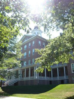 IUP's 374-acre (1.51 km2) main campus is a mix of 62 old and new red brick structures. Its original building, a Victorian structure named John Sutton Hall once housed the entire school. Sutton Hall has been named to the National Register of Historic Places.[18] There was a fight to preserve Sutton Hall in 1974 when the administration scheduled it for demolition.[19] Ironically, today it houses many administrative offices and reception areas. Breezedale Alumni Center is also listed on the National Register of Historic Places. The Victorian mansion was once home to a Pennsylvania Supreme Court Justice.[20]