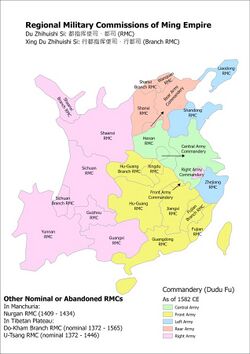 The lowest administrative unit during the Ming dynasty was the county which was supervised by a prefecture through a subprefecture. Prefectures were organized into provinces and administered by three cooperating agencies: the Provincial Administration Commission (chengxuan buzheng shisi), the Provincial Surveillance Commission (tixing ancha shisi), and the Regional Military Commission (du zhihui shisi). The three agencies were directed by a Grand Coordinator and Supreme Commander. The post of Grand Coordinator was indefinite and could last as long as 10 or even 20 years. A Supreme Commander handled military affairs. Neither posts were governorships and were considered special-purpose representatives of the government.[59] The Provincial Administration Commission was in general charge of all civil matters, especially fiscal matters. The Provincial Administration kept three to eight branch offices in each province. Each branch office was headed by an Intendant (daotai) to exercise administrative authority. Each province also had a Tax Intendant (duliang dao). The Provincial Surveillance Commission was headed by a single Surveillance Commissioner, under whom were various vice and assistant commissioners who held censorial and judicial powers. Regional Military Commissioners were responsible for military garrisons in the provinces. Executive officials of the Three Provincial Commissions were collectively known as Regional Overseers. The purpose of this tripartite administration of provinces was so that no one had supreme power in one region.[6]