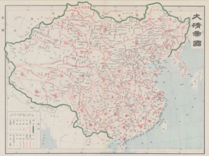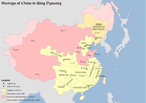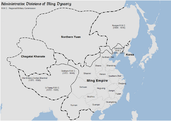 Permanent provincial administrations developed under the Yuan and Ming dynasties.[3] The Yuan province, called a Branch Secretariat (xing zhongshu sheng), was governed by two Managers of Governmental Affairs (pingchang zhengshi). Sometimes a Grand Chancellor (chengxiang) was in charge of an entire province. It's uncertain how much central authority the government had over these provinces since they were essentially ruled by Mongol nobles. Between the provinces and the central government were two agencies: the Branch Bureau of Military Affairs (xing shumi yuan) and the Branch Censorate (xing yushi tai).[5] The Ming provincial government consisted of three cooperating agencies: the Provincial Administration Commission (chengxuan buzheng shisi), the Provincial Surveillance Commission (tixing ancha shisi), and the Regional Military Commission (du zhihui shisi). They were directed by a Grand Coordinator, whose tenure was indefinite, and a Supreme Commander. Executive officials of the Three Provincial Commissions were called Regional Overseers.[6] The Qing dynasty expanded the number of provinces to 18 by 1850 and did away with the tripartite provincial administration. Qing provinces were governed by a single Governor (xunfu) who answered to a Governors-general (zongdu).[7]
