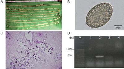 | Diphyllobothriasis – tapeworm | Diphyllobothrium pacificum | intestines | stool (microscope) | Peru | ingestion of raw saltwater fish |
