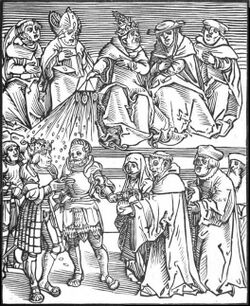 For centuries, monarchs ruled by the idea of divine right. Sometimes this began to be used by a monarch to support the notion that the king ruled both his own kingdom and Church within its boundaries, a theory known as caesaropapism. On the other side was the Catholic doctrine that the Pope, as the Vicar of Christ on earth, should have the ultimate authority over the Church, and indirectly over the state, with the forged Donation of Constantine used to justify and assert the political authority of the papacy.[7] This divine authority was explicitly contested by Kings, in the like of the, 1164, Constitutions of Clarendon, which asserted the supremacy of Royal courts over Clerical, and with Clergy subject to prosecution, as any other subject of the English Crown; or the 1215 Magna Carta that asserted the supremacy of Parliament and juries over the English Crown; both were condemned by the Vatican.[8] Moreover, throughout the Middle Ages, the Pope claimed the right to depose the Catholic kings of Western Europe and tried to exercise it, sometimes successfully, eg. 1066, Harold Godwinson,[9] sometimes not, e.g., in 1305 with Robert the Bruce of Scotland,[10] and later Henry VIII of England and Henry III of Navarre.[11] The Waldensians were a medieval sect that urged separation of church of state.[12]