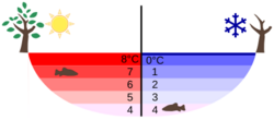 The unusual density curve and lower density of ice than of water is vital to life—if water were most dense at the freezing point, then in winter the very cold water at the surface of lakes and other water bodies would sink, the lake could freeze from the bottom up, and all life in them would be killed.[17] Furthermore, given that water is a good thermal insulator (due to its heat capacity), some frozen lakes might not completely thaw in summer.[17] The layer of ice that floats on top insulates the water below.[18] Water at about 4 °C (39 °F) also sinks to the bottom, thus keeping the temperature of the water at the bottom constant (see diagram).[17]