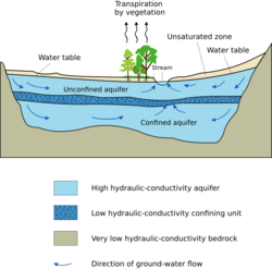An aquifer is an underground layer of water-bearing permeable rock, rock fractures or unconsolidated materials (gravel, sand, or silt). The study of water flow in aquifers and the characterization of aquifers is called hydrogeology. If an impermeable layer overlies the aquifer, pressure could cause it to become a confined aquifer.