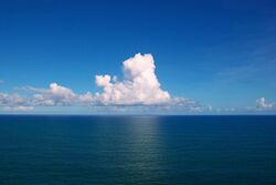 An ocean is a body of water that composes much of a planet's hydrosphere.[1] On Earth, an ocean is one of the major conventional divisions of the World Ocean. These are, in descending order by area, the Pacific, Atlantic, Indian, Southern (Antarctic), and Arctic Oceans.[2][3] The word "ocean" is often used interchangeably with "sea" in American English. Strictly speaking, a sea is a body of water (generally a division of the world ocean) partly or fully enclosed by land,[4] though "the sea" refers also to the oceans.