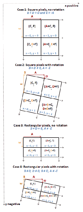 This description is however misleading in that the D and B parameters are not angular rotations, and that the A and E parameters do not correspond to the pixel size if D or B are not zero. The A, D, B and E parameters are sometimes named "x-scale", "y-skew", "x-skew" and "y-scale".