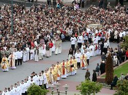 In 2001, to correct these abuses (and many others which had afflicted popular piety since the council), the Catholic Church's Congregation for Divine Worship and the Discipline of the Sacraments issued a Directory on Popular Piety and the Liturgy.[3] Throughout that document, the use (and revival) of processions for various Church festivals is called for, and an entire section devoted to processions alone, in which their importance for all Catholics is underlined.