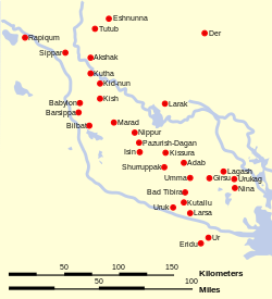 Kish (Sumerian: Kiš; Script error: The function "transl" does not exist.; cuneiform: 𒆧𒆠;[1] Akkadian: Kiššatu,[2] near modern Tell al-Uhaymir) is an important archaeological site in Babil Governorate (Iraq), located 80 km (50 mi) south of Baghdad and 12 km (7.5 mi) east of the ancient city of Babylon. The Ubaid period site of Ras al-Amiyah is 8 km (5.0 mi) away. It was occupied from the Ubaid period to the Hellenistic period.[3] In Early Dynastic times the city's patron deity was Ishtar with her consort Ea. Her temple, at Tell Ingharra, was (E)-hursag-kalama.[4][5] By Old Babylonian times the patron deities had become Zababa, along with his consort, the goddess Bau and Istar. His temple Emeteursag (later Ekišiba) was at Uhaimir.[6]