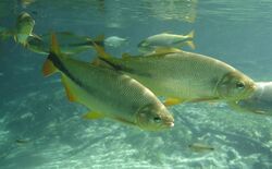 Characidae, the characids or characins is a family of freshwater subtropical and tropical fish, belonging to the order Characiformes. The name "characins" is the historical one,[2] but scientists today tend to prefer "characids" to reflect their status as a by and large monophyletic group at family rank. To arrive there, this family has undergone much systematic and taxonomic change. Among those fishes that remain in the Characidae for the time being are the tetras, comprising the very similar genera Hemigrammus and Hyphessobrycon, as well as a few related forms such as the cave and neon tetras. Fish of this family are important as food and also include popular aquarium fish species.[3]