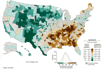 Analysis by the CDC of U.S. mortality statistics from the period 1991 to 1998 found that for both blacks and whites the counties with the highest stroke death rates were in the southeastern states and the Mississippi Delta region. Stroke death rates for states ranged from a high of 169 per 100,000 in South Carolina to a low of 89 per 100,000 in New York.[8] While most observational studies have focused primarily on stroke incidence in adults, in 2004 researchers reported that children in the eleven stroke belt states also have an increased risk of death from ischemic and hemorrhagic stroke compared with children in other states.[9]