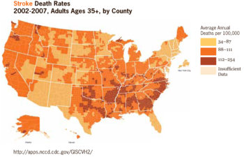 ↑IntroductionArchived 2009-11-24 at the Wayback Machine, Atlas of Stroke Mortality: Racial, Ethnic, and Geographic Disparities in the United States (Casper ML, Barnett E, Williams GI Jr., Halverson JA, Braham VE, Greenlund KJ). Atlanta, GA: Department of Health and Human Services, Centers for Disease Control and Prevention, 2003