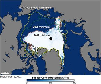 On September 14, 2007, the European Space Agency (ESA) stated that ice loss that year had opened up the historically impassable passage, setting a new low of ice cover as seen in satellite measurements which went back to 1978. According to the Arctic Climate Impact Assessment, the latter part of the 20th century and the start of the 21st had seen marked shrinkage of ice cover. The extreme loss in 2007 rendered the passage "fully navigable."[6][7] However, the ESA study was based only on analysis of satellite images and could in practice not confirm anything about the actual navigation of the waters of the passage. ESA suggested the passage would be navigable "during reduced ice cover by multi-year ice pack" (namely sea ice surviving one or more summers) where previously any traverse of the route had to be undertaken during favourable seasonable climatic conditions or by specialist vessels or expeditions. The agency's report speculated that the conditions prevalent in 2007 had shown the passage may "open" sooner than expected.[8] An expedition in May 2008 reported that the passage was not yet continuously navigable even by an icebreaker and not yet ice-free.[111]