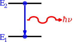 In physics, emission is the process by which a higher energy quantum mechanical state of a particle becomes converted to a lower one through the emission of a photon, resulting in the production of light. The frequency of light emitted is a function of the energy of the transition.