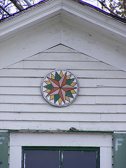 Mass produced hex signs could be purchased separately and hung on farms or houses, and curious tourists became even more interested.[4] Hex signs then began to appear on items created or sold throughout the area, almost becoming a logo for the Pennsylvania Dutch, so that consumers would know who had created the products.[4]Mennonite folk artist Jacob Zook of Paradise, Pennsylvania, holds the claim to having originated the modern mountable painted sign in 1942, based on traditional designs, to be sold in the family souvenir store to tourists along the Lincoln Highway.[6][7]