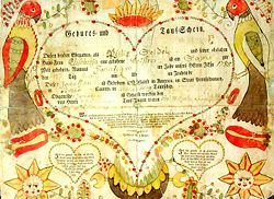 Many consider the Fraktur, a document used by the Pennsylvania Dutch to keep track of family histories and important dates, a forefather to hex signs. Fraktur drawings were executed in ink and/or watercolors and are found in a wide variety of forms: the Vorschriften (writing samples), the Taufscheine (birth and baptismal certificates), marriage and house blessings, book plates, and floral and figurative scenes. The earlier Fraktur were executed entirely by hand, while printed text became increasingly common in later examples. Common artistic motifs in Fraktur include birds, hearts, and tulips. Fonts included in frakturs included numerous variants of calligraphy, especially italic and old English calligraphy. Frakturs were most common between 1740 and 1860. The hex signs which developed from them, beginning in the nineteenth century, were simpler and more purely artistic than frakturs, designed to display familiar images rather than specific information.