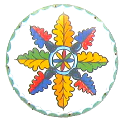 This design, generally one of the more familiar and popular, features a star, typically blue, with eight points, laid out symmetrically. Red tulips and sheaves of wheat are placed between the star's points, in an alternating pattern. The tulips symbolize faith in humanity and trust, while the star and the wheat represent abundance and goodwill. There is also a smaller eight pointed star in the center of the design.[1]