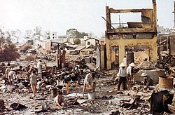 South Vietnam became a dictatorship under its Catholic leader Ngô Đình Diệm, who purged opposition, gave favorable government positions to his family members, and ordered the murder and torture of thousands of suspected communists.[75] A devout Catholic, Ngô turned his regime into a virtual theocracy, making Catholic conversion mandatory for individuals to get good government jobs or for entire villages to avoid forced resettlement.[76] In one of the most famous photographs of the century, Buddhist monk Thích Quảng Đức set himself on fire in Saigon in 1963 as an act of protest.[77] The Ngô regime retaliated by launching raids and attacks on various Buddhist religious sites across South Vietnam, killing and arresting thousands.[78] This only prompted more resistance. The US eventually realized that Ngô was a bad leader and allowed South Vietnamese generals to have him assassinated later in 1963.[79] This didn't do much to improve the quality of leadership.