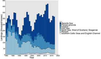Haddock is fished year-round using gear such as Danish seine nets, trawlers, long lines and gill nets and is often caught in mixed species fishery with other groundfish species such as cod and whiting. The main fishing grounds in the eastern Atlantic are in the Barents Sea, around Iceland, around the Faeroe Islands, in the North Sea, Celtic Sea, and in the English Channel. Landings in the eastern Atlantic have fluctuated around 200–350 thousand tonnes in the period 1980–2017. During the 1980s, the largest portion of the catch was taken at Rockall but from about 2000, the majority of the catch is caught in the Barents Sea. All the stocks in eastern Atlantic are assessed by ICES, which publish a recommendations on an annual basis for Total Allowable Catch.[18][19][20][21][22][23][24]
