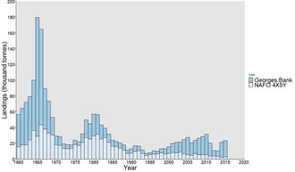 In the western Atlantic the eastern Georges Bank haddock stock is jointly assessed on an annual basis by Canada and the United States and the stock is collaboratively managed through the Canada–United States Transboundary Management Guidance Committee, which was established in 2000. The commercial catch of haddock in North America was approximately 40–60 thousand tonnes per year between 1920 and 1960. This declined sharply in the late 1960s to between 5 and 30 thousand tonnes per year. Despite a few good years post-1970, landings have not returned to historical levels.[11]