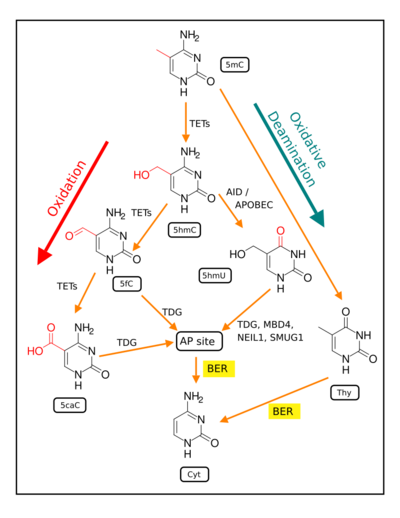 The mechanism behind this experience-dependent demethylation response was previously not fully understood, with some evidence showing that DNMTs may be involved in demethylation.[7] It was also suggested that members of the DNA damage repair GADD45 family may contribute to this demethylation process.[2][3] However, more recently, the pathways illustrated in the Figure below, titled "Demethylation of 5-Methylcytosine (5mC) in neuron DNA," especially the TET dependent pathway, have been confirmed as pathways of DNA demethylation.[9] A role for GADD45 has also recently been indicated, since GADD45 physically interacts with thymine-DNA glycosylase (TDG) and GADD45 may promote the activity of TDG in its role(s) during conversion of 5mC to cytosine.[9]