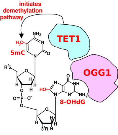 In adult somatic cells, such as neurons, DNA methylation typically occurs in the context of CpG dinucleotides (CpG sites), forming 5-methylcytosine (5mC).[34] Thus, a CpG site may be methylated to form 5mCpG. The presence of 5mC at CpG sites in gene promoters is widely considered to be an epigenetic mark that acts to suppress transcription.[43] If the guanine at the 5mCpG site is attacked by ROS, leading to 8-OHdG formation, OGG1 binds to the 8-OHdG lesion without immediate excision of the 8-OHdG. When OGG1 is present at a 5mCp-8-OHdG site, it recruits TET1 to the 8-OHdG lesion and TET1 oxidizes the 5mC adjacent to 8-OHdG. This causes the 5mC to enter the DNA demethylation pathway (see Figure titled "Initiation of DNA demethylation at a CpG site").[34] This pathway is initiated by formation of 5-hydroxymethylcytosine, which may remain in the DNA, or there may be further oxidative reactions followed by base excision repair, to return the nucleoside at that position to cytosine (see Figure "Demethylation of 5-Methylcytosine (5mC) in neuron DNA").