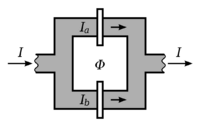 The scanning SQUID microscope is based upon the thin-film DC SQUID. A DC SQUID consists of superconducting electrodes in a ring pattern connected by two weak-link Josephson junctions (see figure). Above the critical current of the Josephson junctions, the idealized difference in voltage between the electrodes is given by[3]