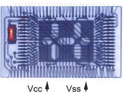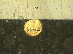 Electrically connecting the failing pin to a ground pin produced the electric current path shown in figure 2. This electrical path strongly suggests that the current is somehow flowing through all the ground nets though a conductive path located very close to the wirebond pads from the top down view of the package. Based on electrical and layout analysis of the package, it can be inferred that current is either flowing through the wirebond pads or that the wirebonds are somehow touching a conductive structure at the specified location. After obtaining similar SSM results on the two units under test, further destructive analysis focused around the small potential short region, and it showed that the failing pin wirebond is touching the bottom of one of the stacked dice at the specific XY position highlighted by SSM analysis. The cross section view of one of those units is shown in figure 3.