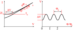 where R is the resistance between the electrodes, I is the current, I0 is the maximum supercurrent, Ic is the critical current of the Josephson junctions, Φ is the total magnetic flux through the ring, and Φ0 is the magnetic flux quantum.