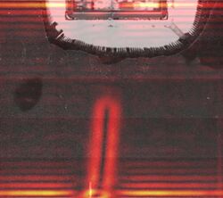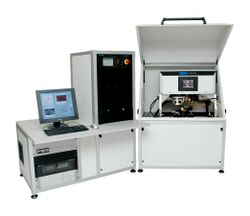 A high temperature Scanning SQUID Microscope using a YBCO SQUID is capable of measuring magnetic fields as small as 20 pT (about 2 million times weaker than the Earth's magnetic field). The SQUID sensor is sensitive enough that it can detect a wire even if it is carrying only 10 nA of current at a distance of 100 µm from the SQUID sensor with 1 second averaging. The microscope uses a patented design to allow the sample under investigation to be at room temperature and in air while the SQUID sensor is under vacuum and cooled to less than 80 K using a cryo cooler. No Liquid Nitrogen is used. During non-contact, non-destructive imaging of room temperature samples in air, the system achieves a raw, unprocessed spatial resolution equal to the distance separating the sensor from the current or the effective size of the sensor, whichever is larger. To best locate a wire short in a buried layer, however, a Fast Fourier Transform (FFT) back-evolution technique can be used to transform the magnetic field image into an equivalent map of the current in an integrated circuit or printed wiring board.[4][5] The resulting current map can then be compared to a circuit diagram to determine the fault location. With this post-processing of a magnetic image and the low noise present in SQUID images, it is possible to enhance the spatial resolution by factors of 5 or more over the near-field limited magnetic image. The system's output is displayed as a false-color image of magnetic field strength or current magnitude (after processing) versus position on the sample. After processing to obtain current magnitude, this microscope has been successful at locating shorts in conductors to within ±16 µm at a sensor-current distance of 150 µm.[6]