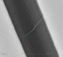 The second fault location technique will be taken somewhat out of turn, as it was used to characterize this failure after the SQUID analysis, as an evaluation sample for an equipment vendor. The ability to focus and resolve low-power X-rays and detect their presence or absence has improved to the point that radiography can now be used to identify features heretofore impossible to detect. The equipment at Xradia was used to inspect the failure of interest in this analysis. An example of their findings is shown in Figure 2. The feature shown (which is also the material responsible for the failure) is a copper filament approximately three micrometres wide in cross-section, which was impossible to resolve in our in-house radiography equipment.