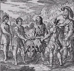 In The Greek Myths (1955), Robert Graves views Oenopion as his perennial Year-King, at the stage where the king pretends to die at the end of his term and appoints a substitute, in this case Orion, who actually dies in his place. His blindness is iconotropy from a picture of Odysseus blinding the Cyclops, mixed with a purely Hellenic solar legend: the Sun-hero is captured and blinded by his enemies at dusk, but escapes and regains his sight at dawn, when all beasts flee him. Graves sees the rest of the myth as a syncretism of diverse stories. These include Gilgamesh and the Scorpion-Men, Set becoming a scorpion to kill Horus and the story of Aqhat and Yatpan from Ras Shamra, as well as a conjectural story of how the priestesses of Artemis Opis killed a visitor to their island of Ortygia. He compares Orion's birth from the bull's hide to a West African rainmaking charm and claims that the son of Poseidon should be a rainmaker.[76]