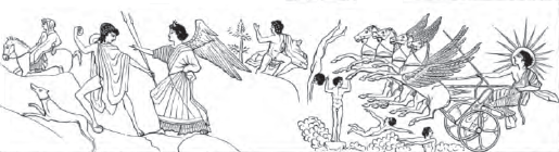 The next picture deals with the ancient story of Orion. He is blind, and on his shoulder carries Cedalion, who directs the sightless eyes towards the East. The rising Sun heals his infirmity; and there stands Hephaestus on Lemnos, watching the cure.[37]