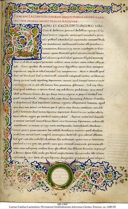 Arguably the most important of Lactantius's works, the Divinae institutiones—the title of which was meant to correspond to the institutiones that expressed the workings of civil law—is both a systematic as well as apologetic work that, as Patrick Healy argues, "point out the futility of pagan beliefs and to establish the reasonableness and truth of Christianity."[1][2] The work was the first full attempt to defend Christian theology in Latin, and it was likely written to appeal to and convince educated pagans.[1][3] While Lactantius focused much of Divinae institutiones on combating the claims of pagan writers (who at the time were aiding the persecutors of Christianity by writing specialized attack pamphlets), the author also sought to make his work "sufficiently broad" so that it might stem criticisms from all directions.[1]