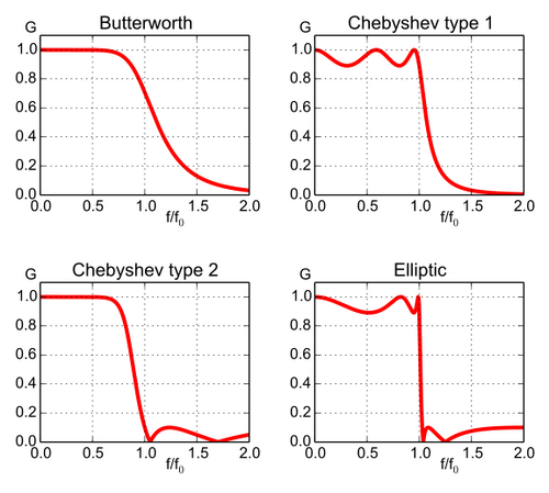 Here is an image comparing Butterworth, Chebyshev, and elliptic filters. The filters in this illustration are all fifth-order low-pass filters. The particular implementation – analog or digital, passive or active – makes no difference; their output would be the same. As is clear from the image, elliptic filters are sharper than the others, but they show ripples on the whole bandwidth.