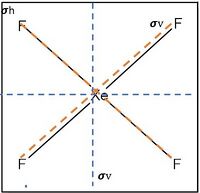 Mirror planes are denoted by σ. In a molecule that also has an axis of symmetry, a mirror plane that includes the axis is called a vertical mirror plane and is labeled σv , while one perpendicular to the axis is called a horizontal mirror plane and is labeled σh . A vertical mirror plane that bisects the angle between two C2 axes is called a dihedral mirror plane, σd .[6]