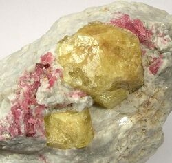 Large (up to 1.8 cm) yellow londonite crystals associated with rubellite tourmaline. Londonite is an unusual caesium-rich heptaborate.