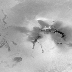 Galileo flew by Io again on October 16, 2001, this time passing over the satellite's south polar region at an altitude of 184 km (114 mi). As a result of the discovery of the Thor eruption during the previous flyby, the observation plan was adjusted so that the camera and near-infrared spectrometer could take high-resolution images and spectra of the new eruption site. The camera acquired a single, clear-filter frame over the volcano with a spatial resolution of 334 meters (1,100 ft) per pixel.[7] The image revealed several new dark, silicate lava flows, many surrounded by dark, pyroclastic flow deposits.[1] The dark flows generally covered over the previously observed yellow flows, though by October 2001, some of those older flows remained visible. The source of a large dark flow on the eastern side of the volcano appears to be a fissure 50 by 17 km (31 by 11 mi) in size. This fissure maybe a patera, or volcanic depression, in the process of forming.[4] Distant color imaging taken a few hours after the flyby showed that the volcanic plume at Thor was still visible.[1][12]