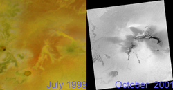 Low-resolution images of the anti-Jupiter hemisphere of Io, showing the effects of the Thor eruption in August 2001[1]