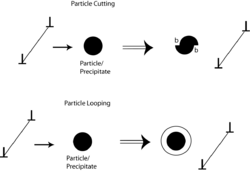 These governing equations show that the precipitation hardening mechanism depends on the size of the precipitate particles. At small [math]\displaystyle{ r }[/math], cutting will dominate, while at large [math]\displaystyle{ r }[/math], bowing will dominate.