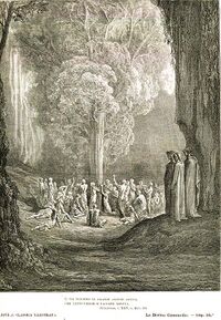 Le Goff dedicates the final chapter of his book to the Purgatorio, the second canticle of the Divine Comedy, a poem by fourteenth-century Italian author Dante Alighieri. In an interview Le Goff declared: "Dante's Purgatorio represents the sublime conclusion of the slow development of Purgatory that took place in the course of the Middle Ages. The power of Dante's poetry made a decisive contribution to fixing in the public imagination this 'third place', whose birth was on the whole quite recent."[57] Dante pictures Purgatory as an island at the antipodes of Jerusalem, pushed up, in an otherwise empty sea, by the displacement caused by the fall of Satan, which left him fixed at the central point of the globe of the Earth. The cone-shaped island has seven terraces on which souls are cleansed from the seven deadly sins or capital vices as they ascend. Additional spurs at the base hold those for whom beginning the ascent is delayed because in life they were excommunicates indolent or late repenters. At the summit is the Garden of Eden, from where the souls, cleansed of evil tendencies and made perfect, are taken to heaven.