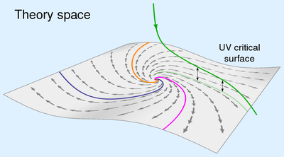 The construction of a quantum field theory amounts to finding an RG trajectory which is infinitely extended in the sense that the action functional described by \(\{g_\alpha(k)\}\) is well-behaved for all values of the momentum scale parameter \(k\), including the infrared limit \(k \rightarrow 0\) and the ultraviolet (UV) limit \(k \rightarrow \infty\). Asymptotic Safety is a way of dealing with the latter limit. Its fundamental requirement is the existence of a fixed point of the RG flow. By definition this is a point \(\{g_\alpha^*\}\) in theory space where the running of all couplings stops, or, in other words, a zero of all \(\beta\)-functions: \(\beta_\gamma(\{g_\alpha^*\})=0\) for all \(\gamma\). In addition that fixed point must have at least one UV-attractive direction. This ensures that there are one or more RG trajectories which run into the fixed point for increasing scale. The set of all points in the theory space that are "pulled" into the UV fixed point by going to larger scales is referred to as UV critical surface. Thus the UV critical surface consists of all those trajectories which are safe from UV divergences in the sense that all couplings approach finite fixed point values as \(k \rightarrow \infty\), see Figure 1. The key hypothesis underlying Asymptotic Safety is that only trajectories running entirely within the UV critical surface of an appropriate fixed point can be infinitely extended and thus define a fundamental quantum field theory. It is obvious that such trajectories are well-behaved in the UV limit as the existence of a fixed point allows them to "stay at a point" for an infinitely long RG time.