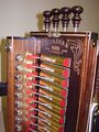 The front left-hand side (bass side) of a Cajun accordion