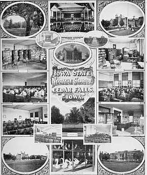 The University of Northern Iowa was founded as a result of two influential forces of the nineteenth century. First, Iowa wanted to care for orphans of its Civil War veterans, and secondly, Iowa needed a public teacher training institution. In 1876, when Iowa no longer needed an orphan home, legislators Edward G. Miller and H. C. Hemenway started the Iowa State Normal School.[7]